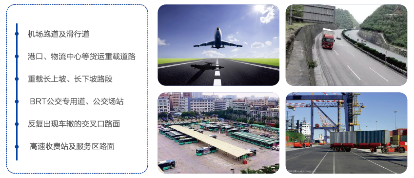 NRP其可用于高速公路和国省道的特重交通,长上坡、长下坡路段,城市道路公交专用道和公交港湾、重载交叉口机场跑道、高速收费站及服务区等容易发生车辙流动变形路段。